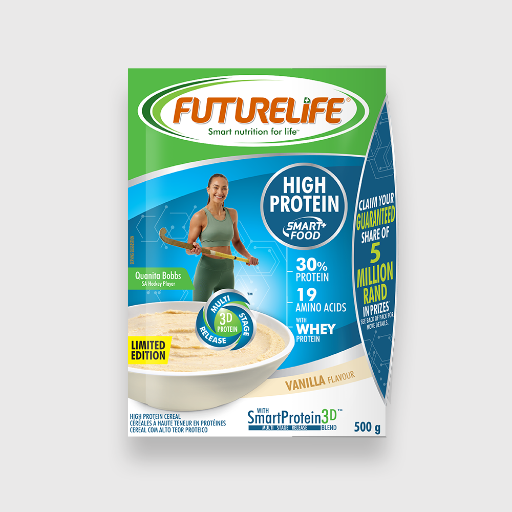 30% Protein- FUTURELIFE®HIGH PROTEIN Smart food™ is high in protein which assists in the maintenance of muscle mass. FUTURELIFE®HIGH PROTEIN Smart food™ has been formulated with SmartProtein3D™ which is a scientific blend of 3 protein sources (Whey, Casein, Soy).